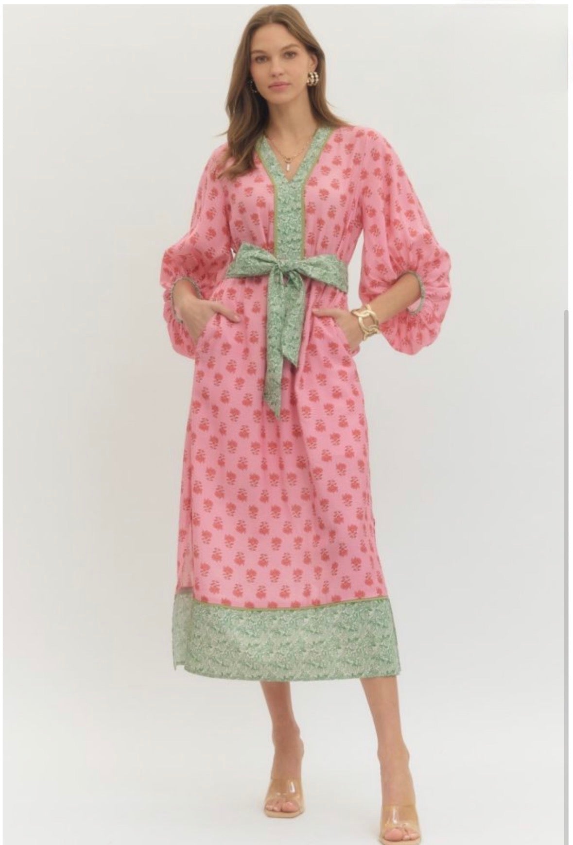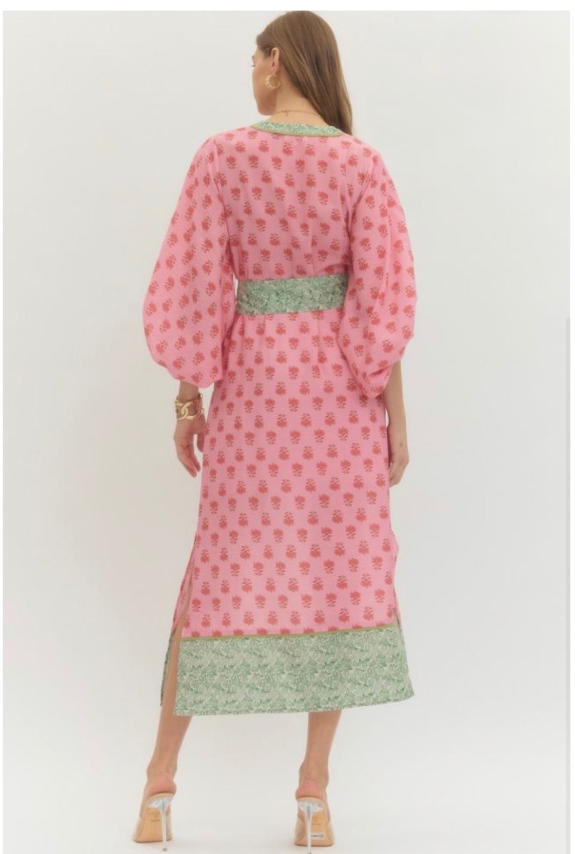 Blakely Dress in Pink Print w/ Green Belt